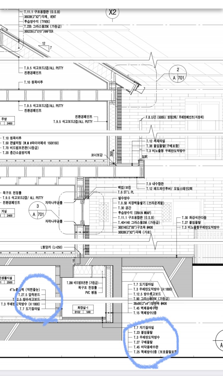 3,4,5 보통 단독주택이라면 시멘트액체방수를 많이쓰는데 도막방수로 되어있는것이 더 신경을 더 많이 쓴겁니다.