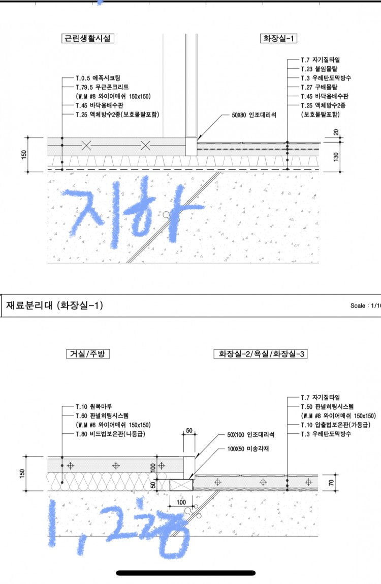 예컨대, 지하층 근린생활시설은, 액체방수2종(보호몰탈 포함) t25, 위에 바닥용배수판t45, 무근콘크리트T79.5, 에폭시 코팅 이렇게 되어 있습니다.