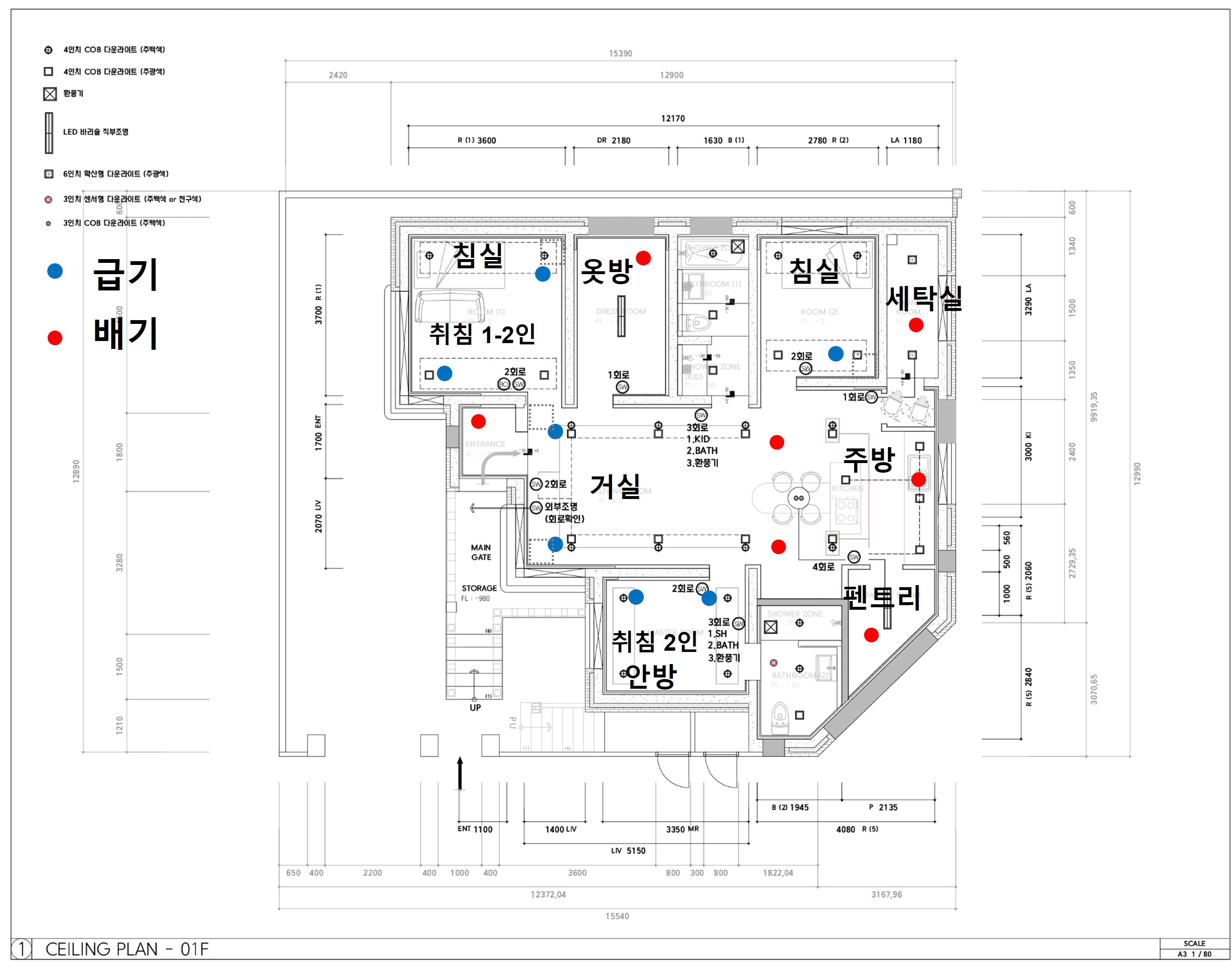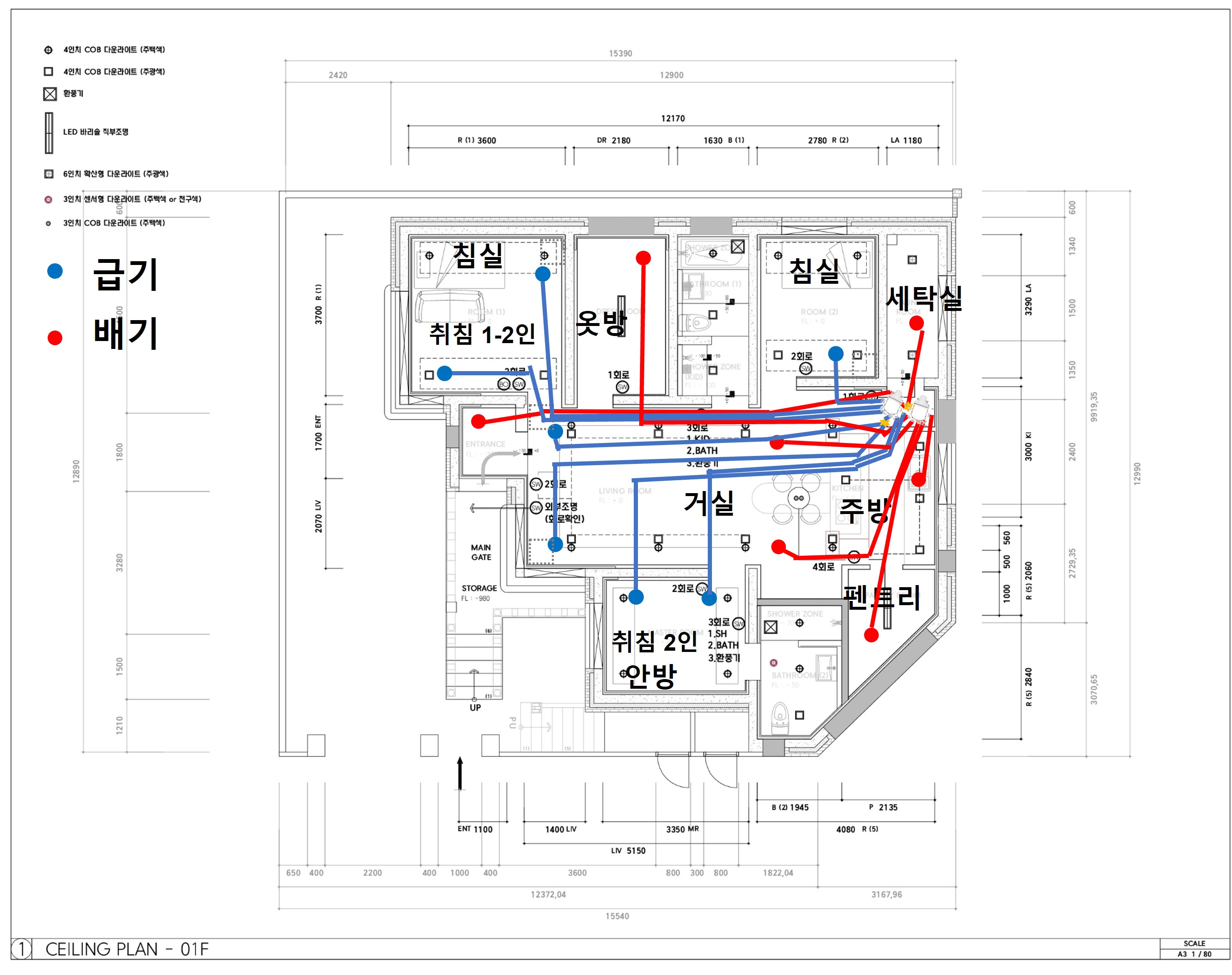 각각 Y관을 사용한곳은 급기는 거실, 배기는 세탁실과 현관으로 하였습니다.
