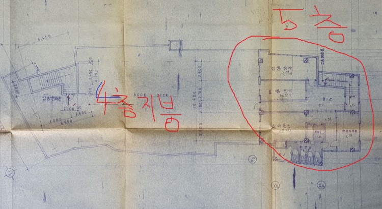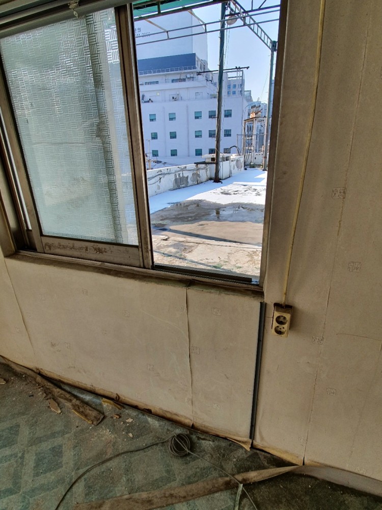 오랜시간 공실로 비워진 5층을 정비하려고 보니 5층의 바닥면의 높이가 원설계의 시멘트 바닥면(도끼다시)보다 20cm정도가 높여져 있었습니다. 어떤방은 나무판 구조물로, 또 어떤방은 나무 구조물 위에 얇은 시멘트로 덮여져 있는듯 합니다. 추정컨데 화장실에서 떨어져 있는 공간에 샤워실을 만들기 위해서 밑에 수도,하수 배관의 설치 떄문인듯 합니다.