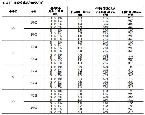 소규모구조기준을 따르는 공사를 하고 계시다면 아래와같은 바닥장선 경간표를 참고하시는게 맞겠지요