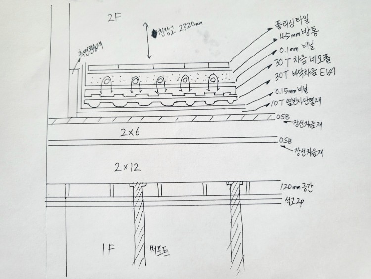설계와 구조계산에는 2x12단일이었으나 층간소음완화 목적으로 2x6장선과 OSB를 개인적으로 추가하였습니다.