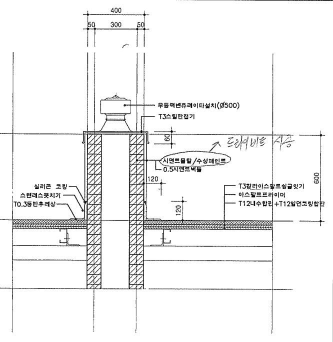 다만, 도면을 보니 (다운받고 삭제하였습니다.) 상세도가 없기에.. 그 것이 철재인지 아닌지 등의 정보가 필요하게 되었습니다. 예를 들어 얇은 함석판으로 만들어진 굴뚝 같은 거라면, 방수 자체가 안되기에...