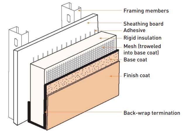 이처럼 부분적인 외단열을 교체 할 때는 아래와 같이 단열재 뒷면으로 메쉬미장이 넘어가는 구조여야 합니다. 그래야 쓸모없는 재료분리대를 생략해도, 마감재의 탈락이나 균열을 막을 수 있기 때문입니다.