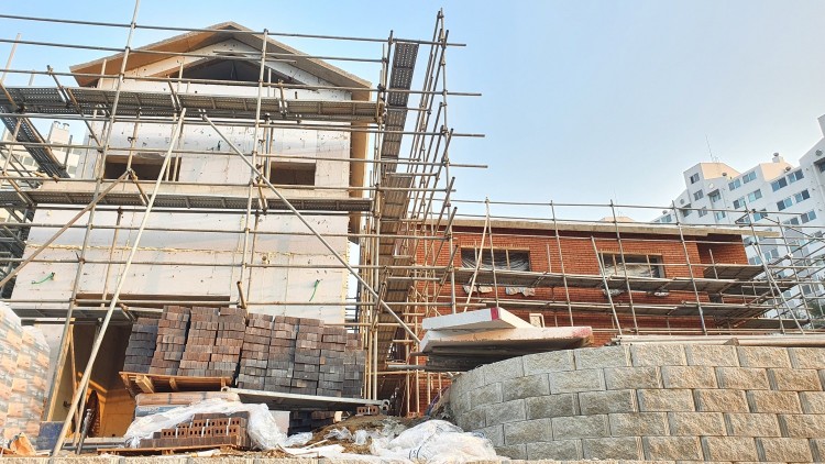 사진상 왼쭉에 현재 회색 벽돌을쌓고있는집입니다.