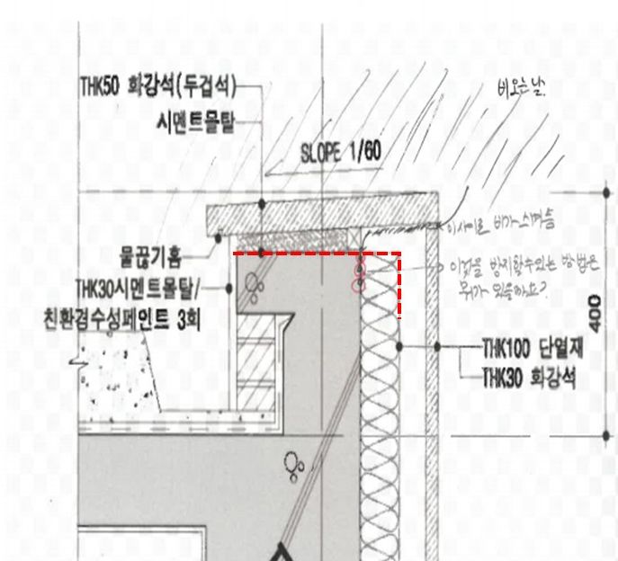 두번쨰 사진을 보시면 왼쪽 콘크리트 와 단열제 사이가 빈공간으로 인해 나중에 비가 스며들어 문제가 될까 걱정하는마음에 미리 방지하고자 방법을 찾고 있습니다. 위에 두겁석과 물끊기를 하더라도 쫌더 물 스며드는거에 방지 하려고 여쭤봅니다.