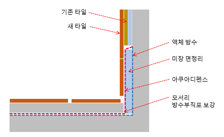 다만 벽 타일은 덧방 이므로, 이 만나는 곳의 처리 개념도는 아래와 같습니다.