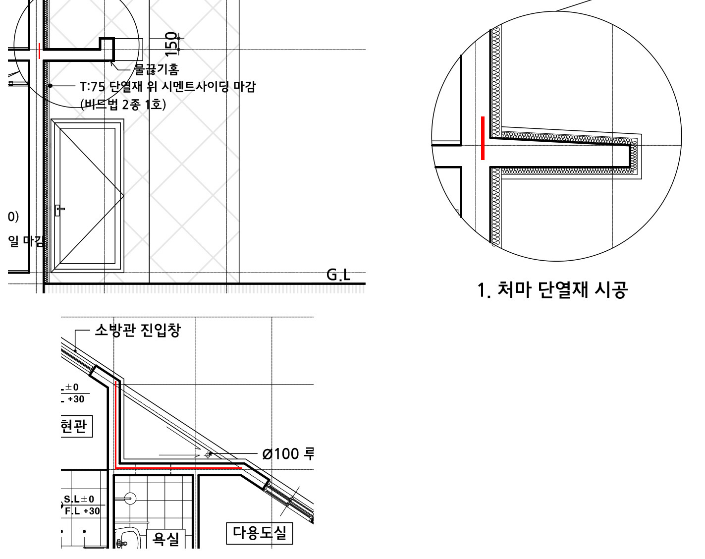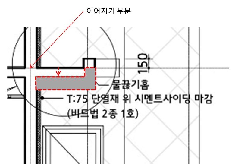 처음 도면에서는 맨 처음과 같은 형태로 나오길래 설계사님께 열교가 발생하는 것에 대해 문의하였더니 단열재시공이나 열교차단재를 시공할 수 있다고 도면에 첨부해주셨습니다.