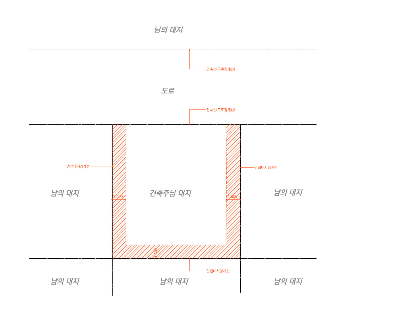 내대지와 이웃대지(사업부지외 부지)와의 경계선이 인접대지경계선입니다.