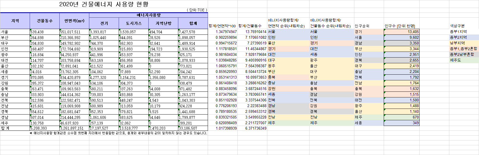그래도 일단 제주도가 가장 에너지적으로 좋은 동네라는것과 중부1,2지역과 남부지역적 차이와는 에너지사용량은 큰 상관이 없다는걸로 보여지긴 합니다.
