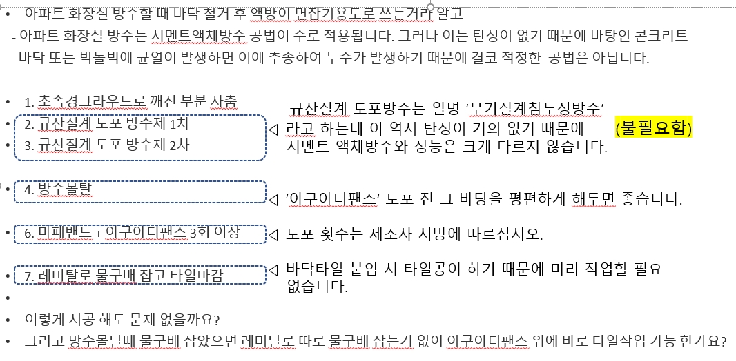 아파트 화장실 방수할 때 바닥 철거 후 액방이 면잡기용도로 쓰는거라 알고