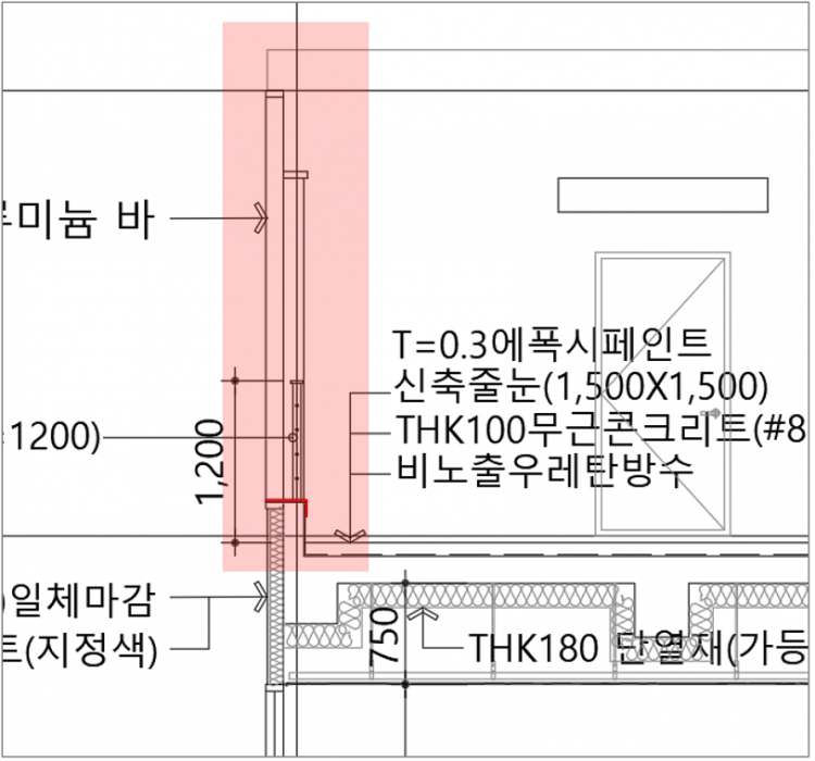 개념적으로는 아래와 같습니다. 다만 하자없는 실현되기는 어려운 디자인입니다. 즉 제대로 하려면 비용이 너무 많이 들어가는 형태여요. 그리고 평지붕의 내단열, 방수의 방법, 노출된 에폭시페인트 등 모든 것이 잠재적 하자를 안고 있는 형식입니다. 여기서 다 적을 수는 없고, 우선 아래 글을 한번 보시면 좋겠습니다. http://www.phiko.kr/bbs/board.php?bo_table=z3_01&wr_id=2988 http://www.phiko.kr/bbs/board.php?bo_table=z3_01&wr_id=351 http://www.phiko.kr/bbs/board.php?bo_table=z3_01&wr_id=3038