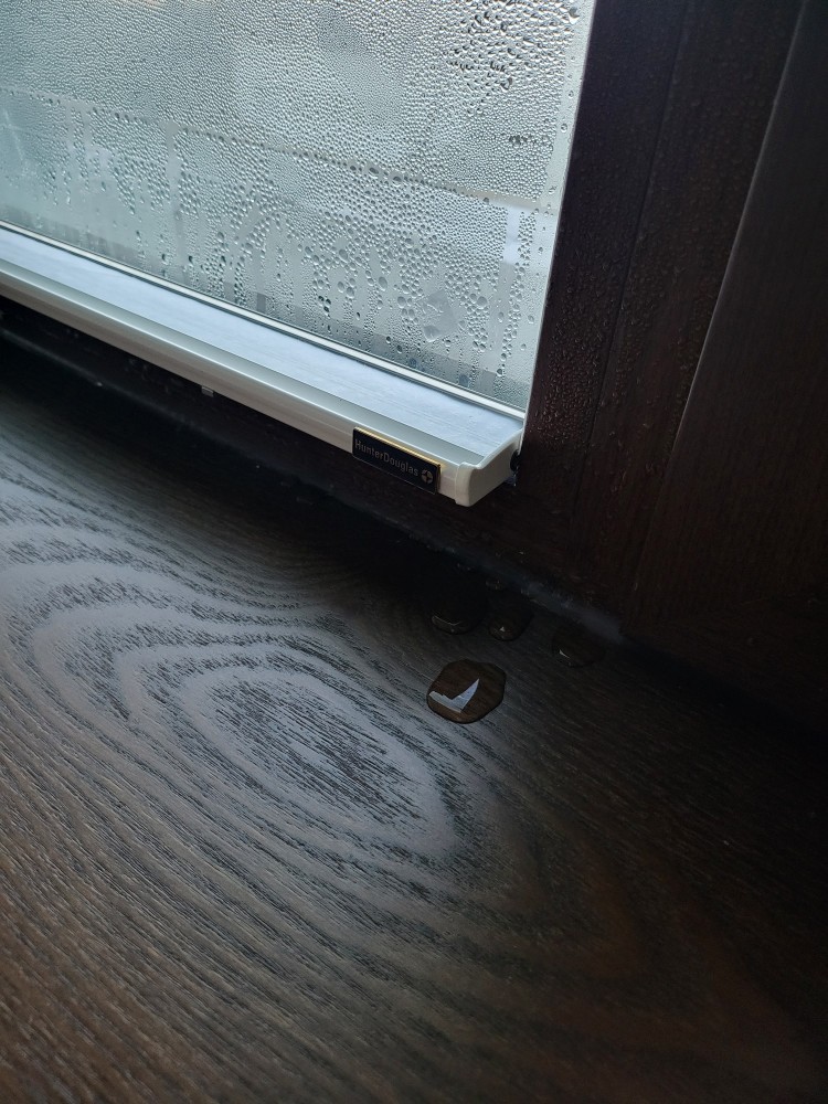세대 내 유리창에 성에가 기본적으로 발생하고 유리에 발생하는 결로수로 인해 원목마루 변색이 일어나 교체까지 진행하였습니다.