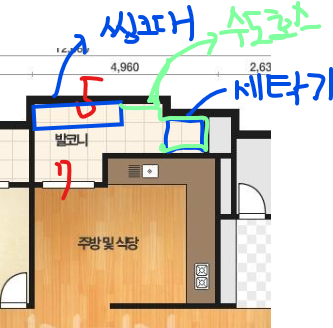 2. 주방 베란다에, 보조씽크대과 세탁기가 있는데, 세탁기 옆의 수도구멍이 세탁기에 걸려서, 수도꼭지를 보조씽크대와 세탁기 사이까지 호수로 연결하여 중간 지점에 만들었습니다. 그래서 한겨울 추운 날엔 물이 호수를 이동하며 얼기때문에, 보조씽크대와 세탁기 모두 사용할 수가 없어요.