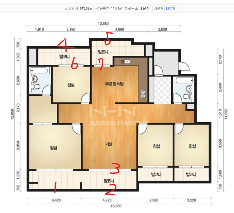 아래 도면에서 보듯이, 저희 집은 복도쪽 침실 2개는 확장하여 이중창이고, 안방 내창도 이중으로 되어 있어서, 그대로 유지하고, 도면의 번호 매긴 곳만 창호를 할 예정입니다.