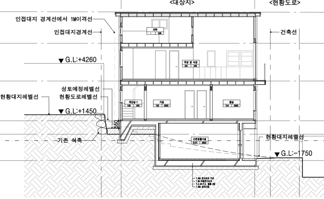네..지하층 외벽은 아직 설계도면에 명시가 안 됐습니다. 아직 초안이라서요..건축심의 전에 다른 심의를 위한 단계입니다..