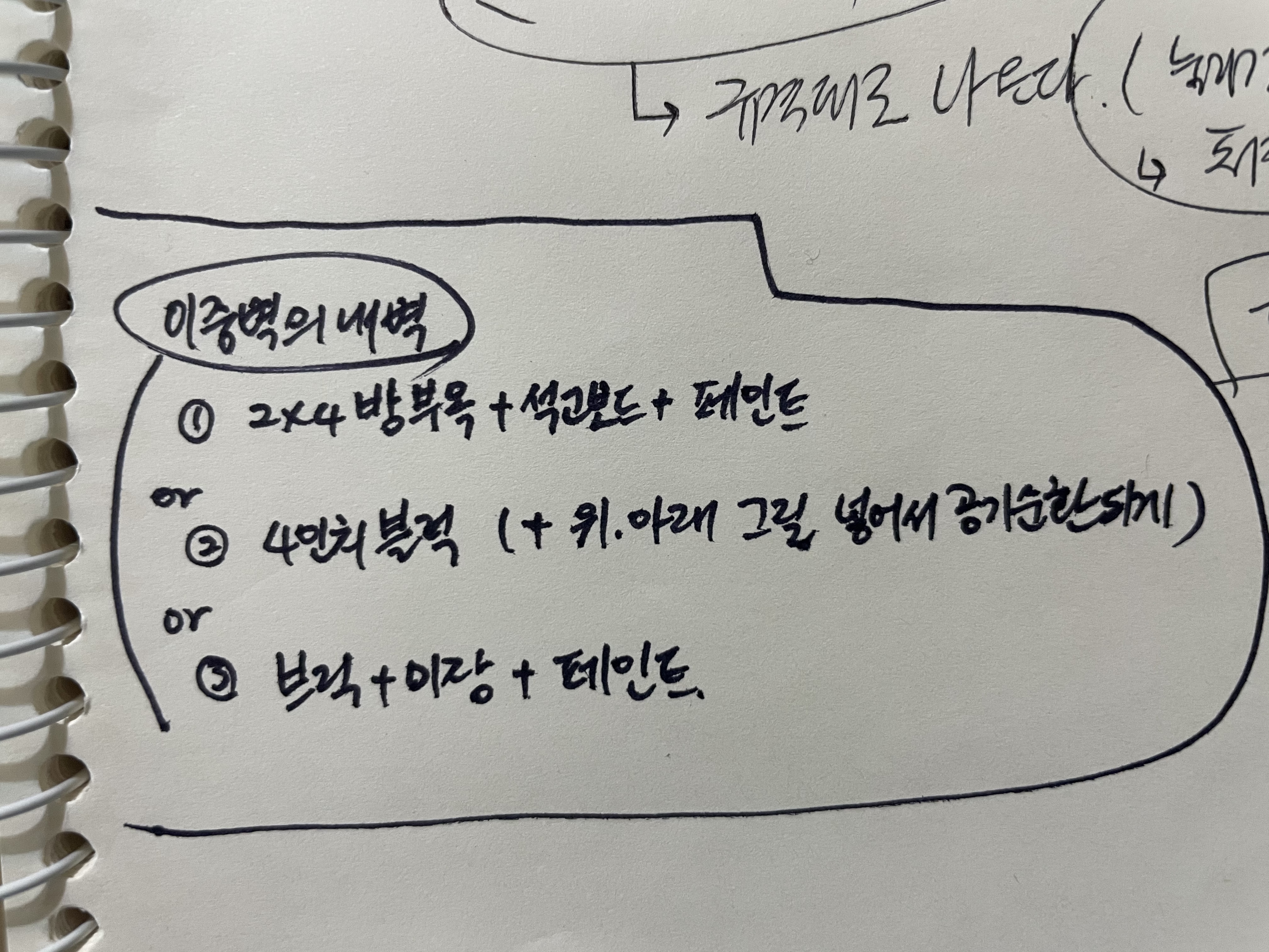 이건 건축사님이 제안한 이중벽 내벽의 세 가지 선택지입니다.