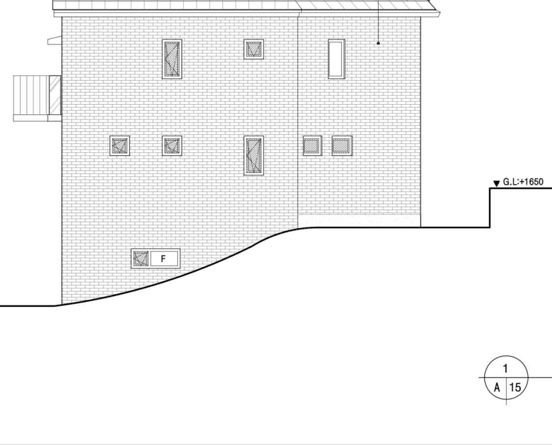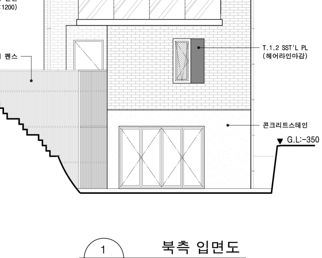 1. 1,2층 외벽은 지금 설계상으로는 조적입니다. 지하층 외벽은 일단 콘크리트스테인으로 해놓았어요.  며칠 내로 파벽돌이나 세라믹서이딩으로 변경해서 심의 때 제출할 예정입니다.