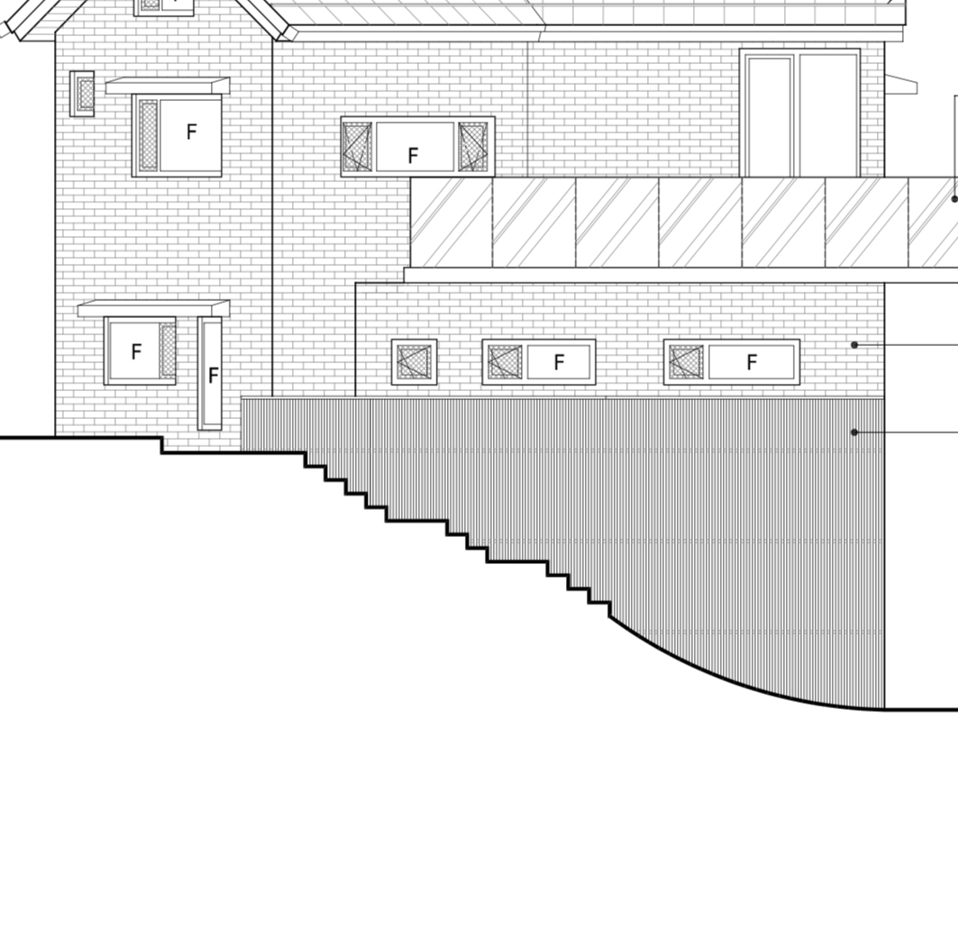 지하층 외벽 수직선으로 된 건, 일종의 담장 같은 건데요, 그 안에 1층으로 올라가는 외부계단이 있습니다. 밖에서 안 보이게 가릴 목적으로 투시형 목재루버펜스를 설치합니다. (아래에 정면에서 본 입면도 사진 첨부할게요)