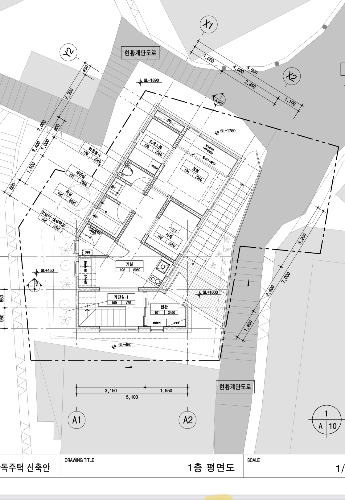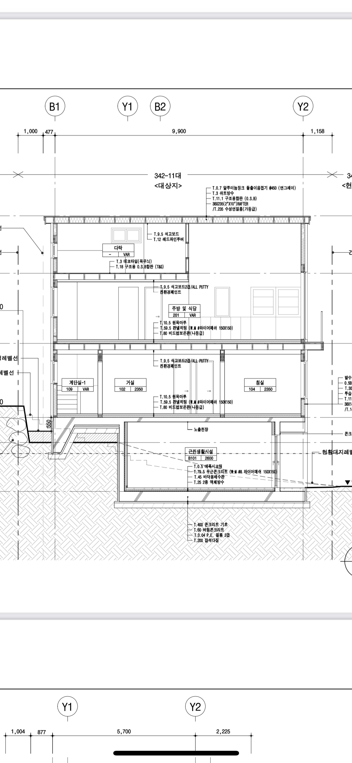 1. 1층 목구조가 더 돌출된 상태라면, 그 하부에 콘크리트 기초가 형성되어야 합니다. 단면도를 보니 이미 그렇게 되어 있는 것 같습니다.