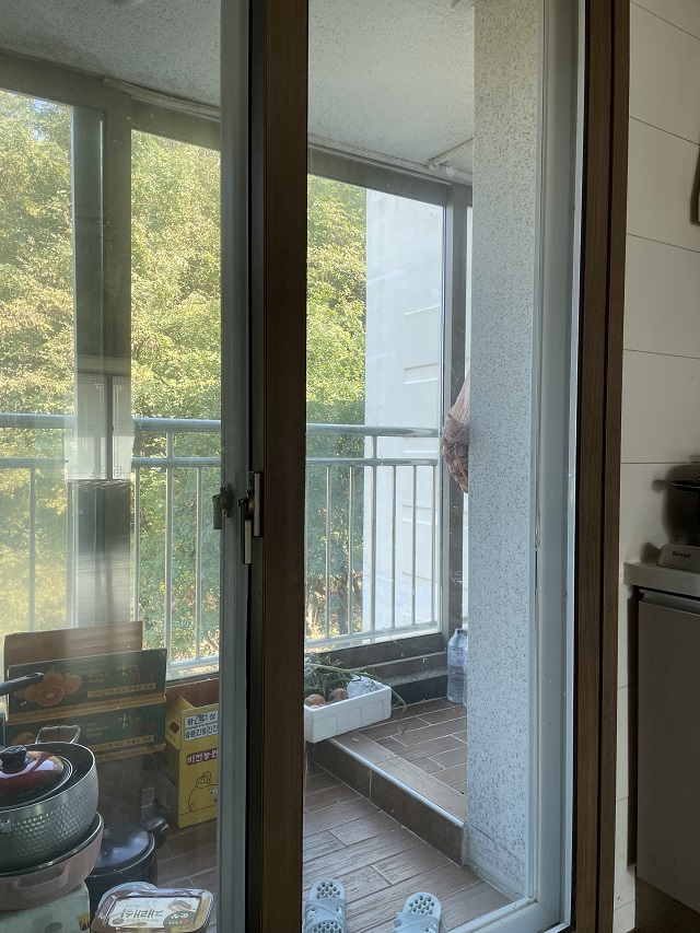 사진과 같이 이 집은 주방 쪽 발코니 창이 하나의 전창으로 시공된 경우입니다. 보통은 창이 두 개고 그 사이에 콘크리트 외벽이 있는 경우와 좀 다른데요.