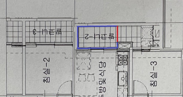 내부 분합창을 제거한 후 도면처럼 파란 선 영역을 확장하고, 빨간 선에는 터닝 도어나 일반 도어를 설치하려는 계획을 갖고 있습니다. 베란다의 외부 창은 하부는 고정창 상부는 반창으로 교체하고, 하부엔 단열재와 석고보드로 마감을 하고요.