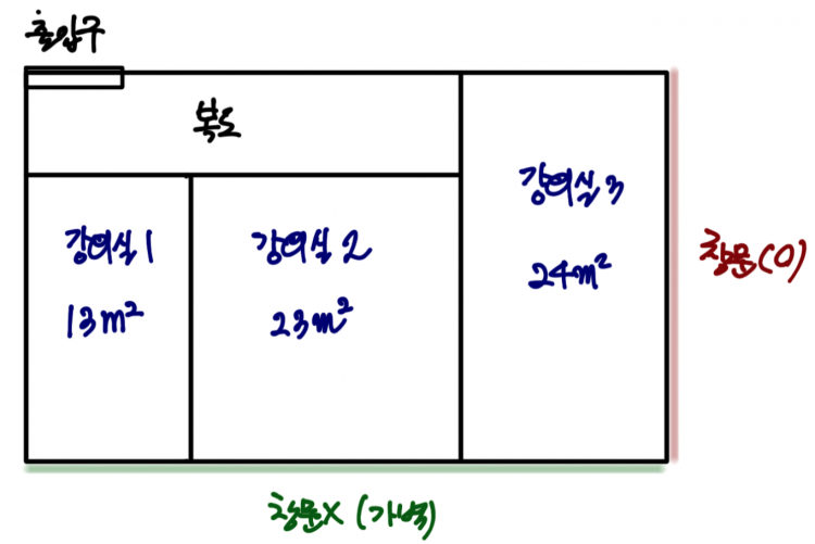 도면은 아래와 같은데 강의실에 급기 복도에 배기를 설치하려 합니다.