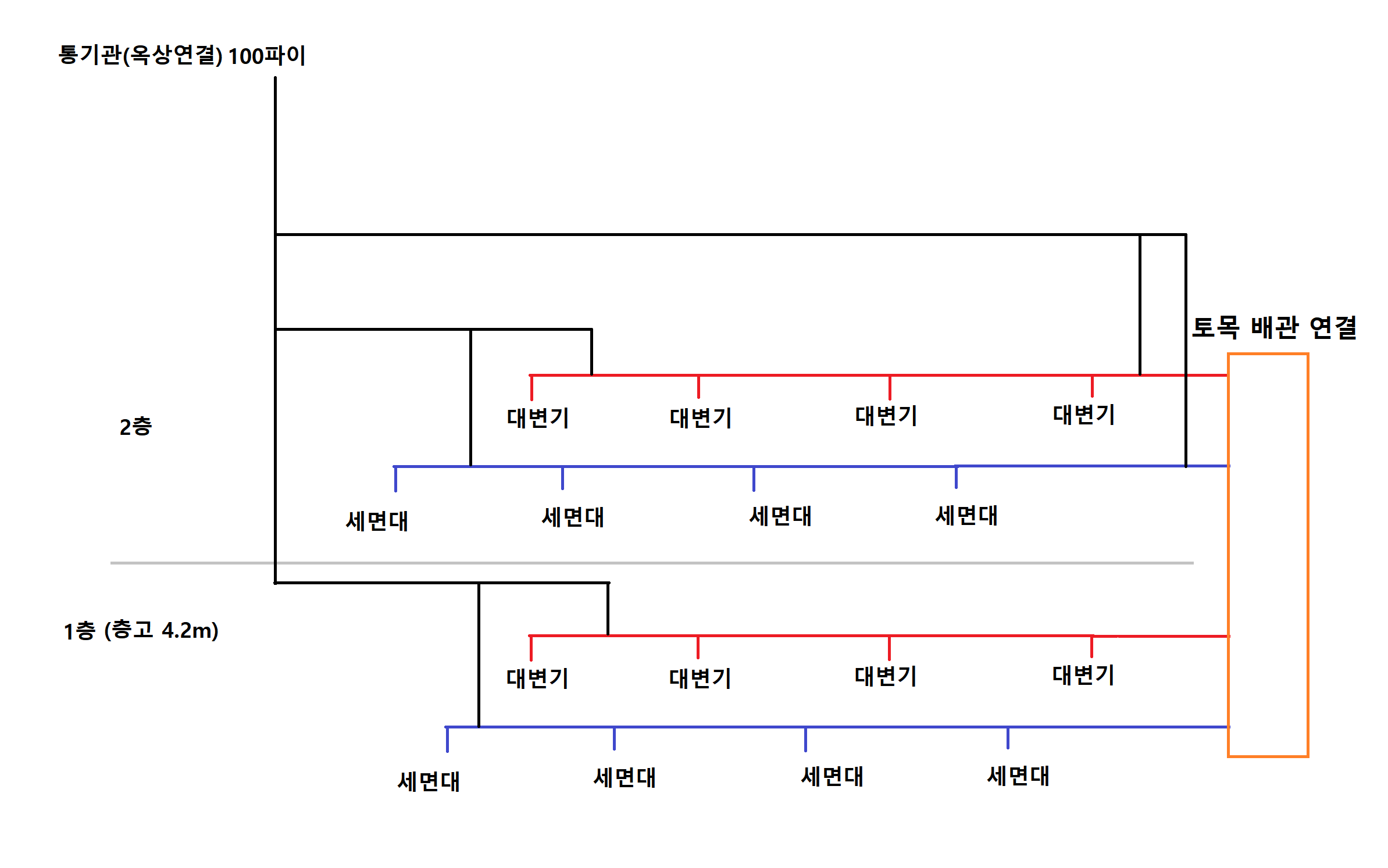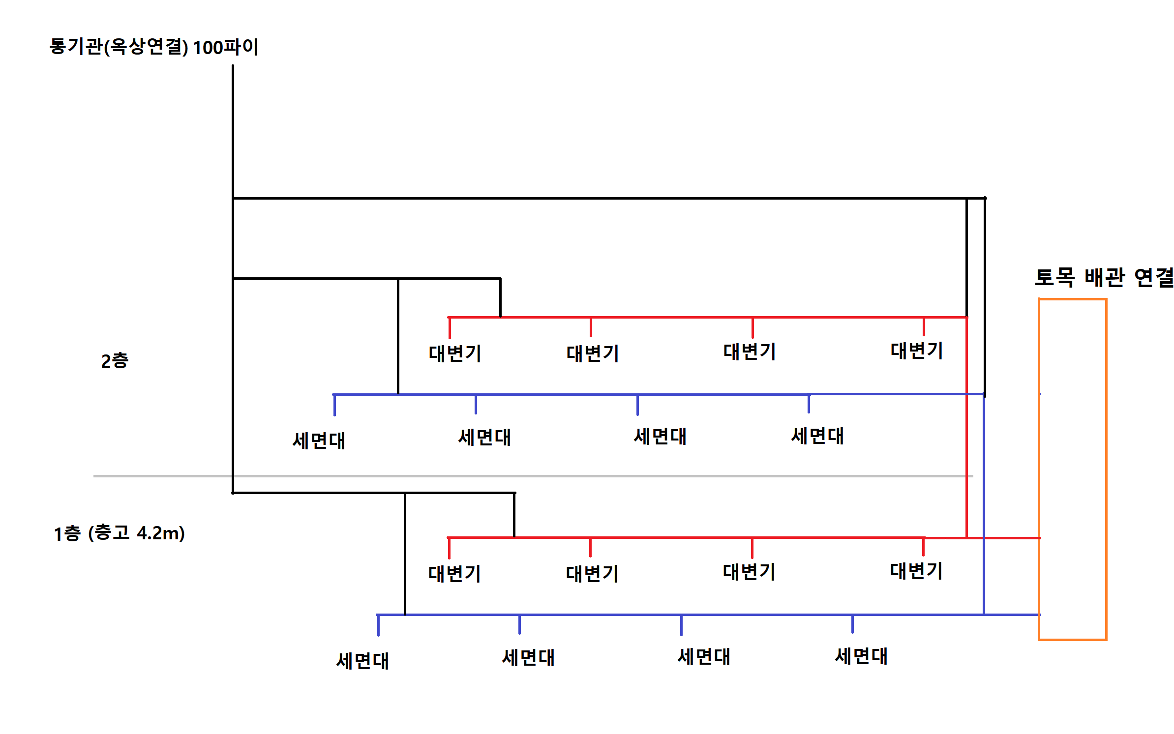 2. 그럼 혹시 1층 통기관이 수직으로 그냥 올라가서 2층 통기관과 묶이는 것은 공간적으로 가능할까요? 보통 한 루프에 8개의 기구를 권장하고 있으므로, 이론상 1,2층을 하나로 묶을 수 있어 보이거든요..