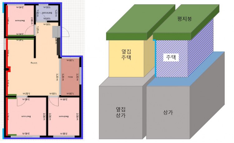 3. 왼쪽 그림 처럼 세 면(보라색)은 외단열을 하고, 옆집과 붙은 면(빨간색) 내단열을 할 경우