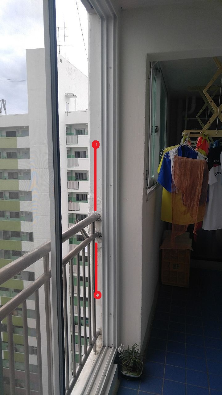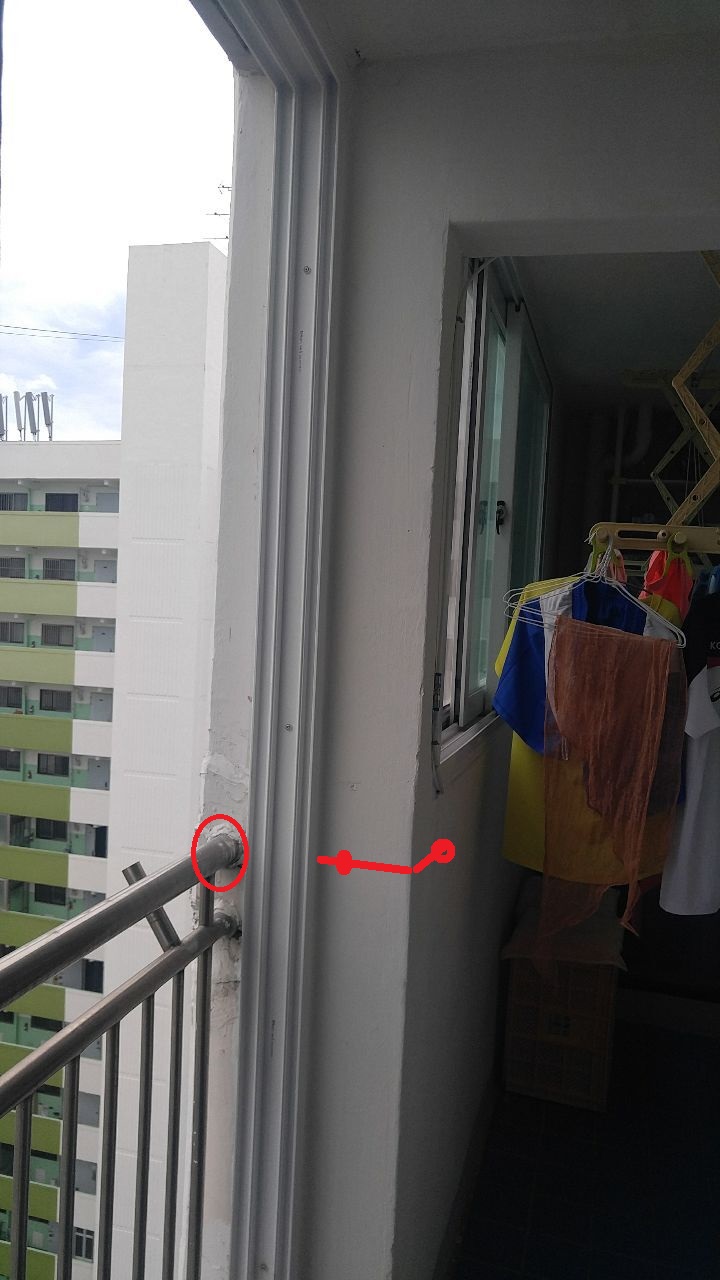 3. 난간대 잡아주는 부분 만들고( 붉은색 원 ) 샤시틀에 구멍을 내서 내벽쪽에 고정하는 지지대 만들어 주는게 좋을까요?