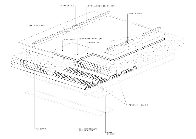 퍼린->데크->180T PF보드->12T합판->지붕용 투습방수지 - 각파이프 50x50(통기층) - 내수합판 - 방수시트->징크