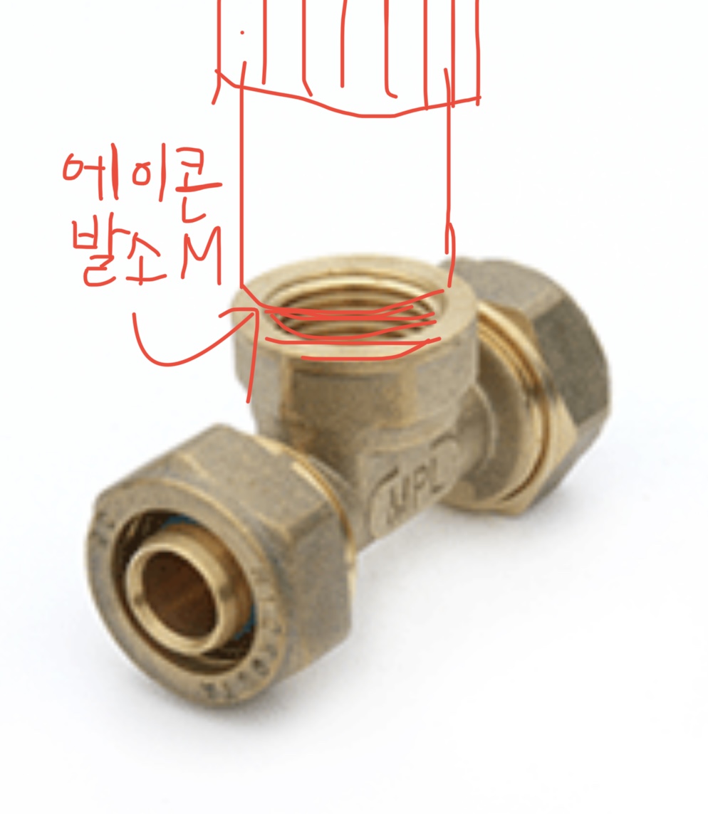 안녕하세요. 오래된 메타폴관을 pb관으로 바꾸려고 합니다. 삼방t로 연결이 되어있는데 어떤 연결 부속을 써야할지 몰라서 문의 드립니다. 빨간 표시되어있는 부분 메타폴은 분리해서 제거하고 새로 pb관을 저기에 연결하려 하는데 어떤 연결 부속을 사용해야할까요?