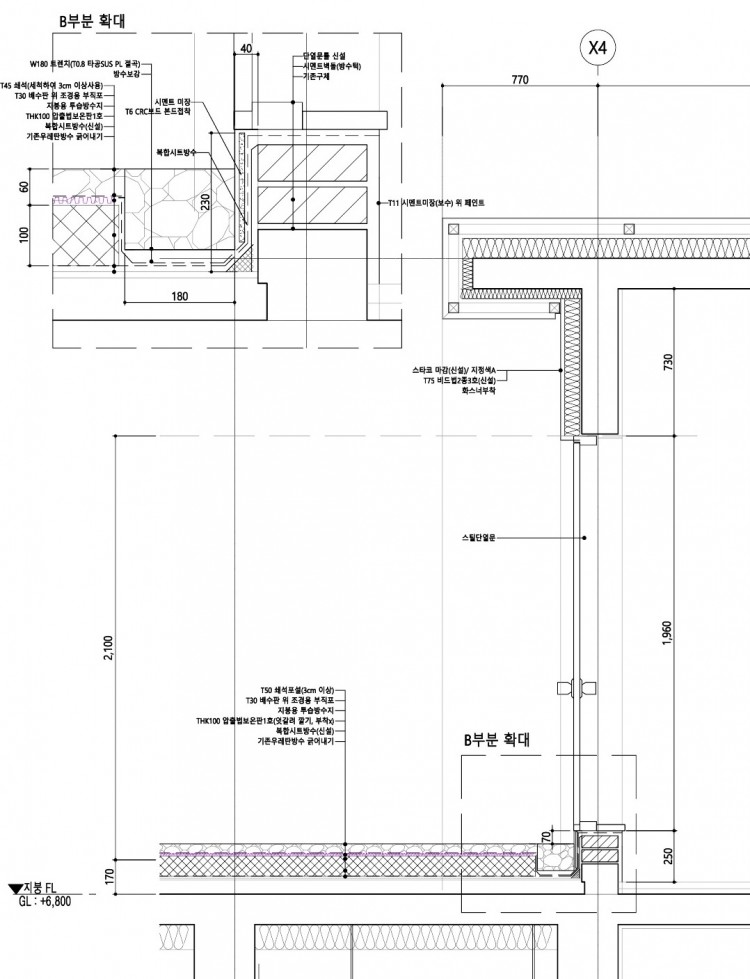 옥상에는 외단열 방식으로 지붕 단열을 계획했으며, 옥탑 출입문이 옥상 슬라브와 높이 차가 거의 없어, 조적을 쌓아 단차를 만들고 비노출 방수를 적용했습니다.