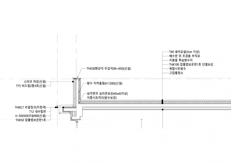 3. 시트방수를 벽면에 그냥 수직으로 붙여 놓을 수는 없습니다. 여름철에 녹아서 쳐지기 때문입니다. 그러므로 파라펫 상단까지 올리던가, V커팅을 해서 홈에 집어 넣고 고정을 해야 하는데, 전자의 방법을 더 권장합니다.