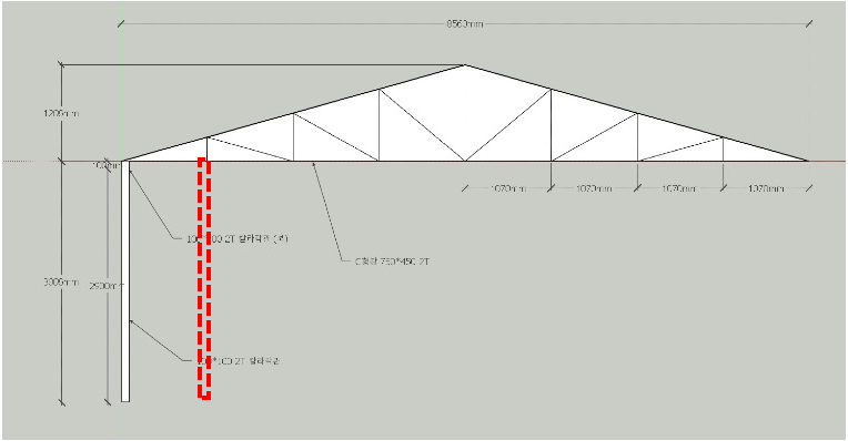 2. 내부가 8300 이며 100*100 2T 높이 3M 각관을 기둥으로하는 박공형 트러스구조는