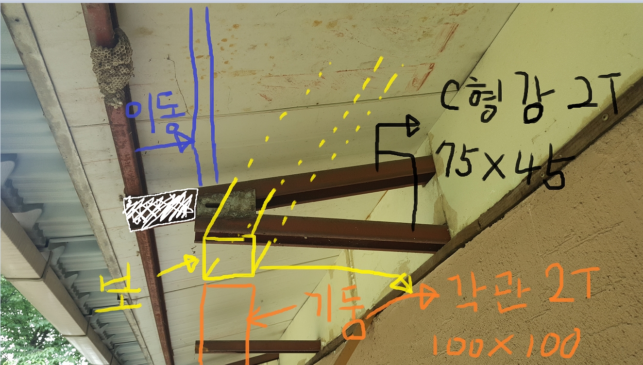 그러므로 그나마 안전을 확보하기 위해서라도 지붕의 하중을 줄여야 하고, 그러기 위해서는 최소한 아래 그림의 위치에서 기둥이 들어가야 하는데요..