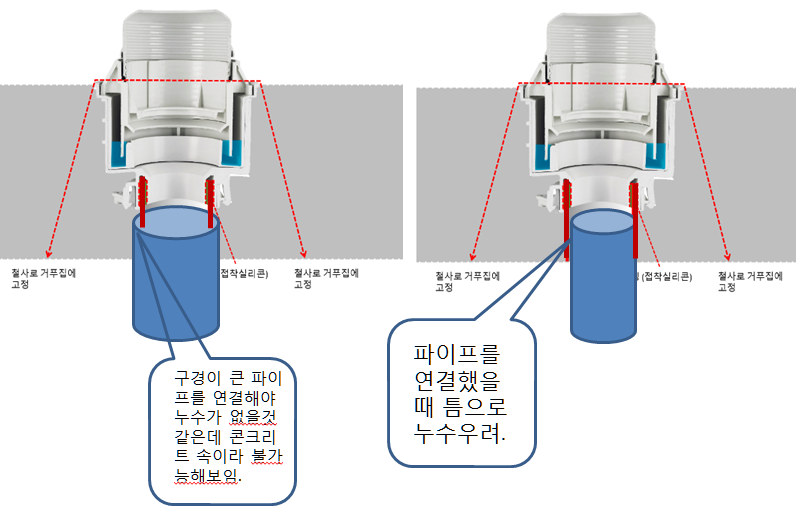 죄송한데 철사로 거푸집에 고정한 부품 그림을 보면  본딩되 있는 배관보다는 작은 배관을 찔러 넣어야 아래에서 배수관이 연결이 되는 구조인데 물의 흐름상 구경이 반대로 연결되는거라서  누수 염려없이 잘 연결될 수 있는지도 이해가 잘 안됩니다ㅠㅠ