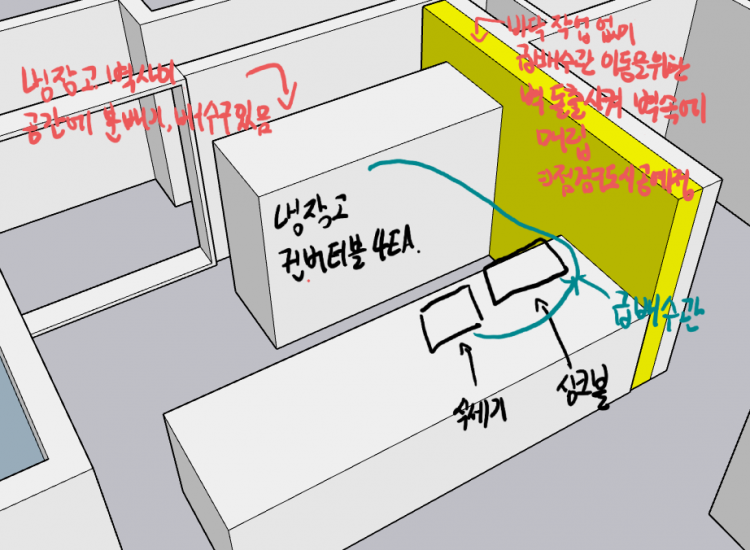 냉장고라고 써진 입체면은 실제 냉장고가 4대 들어갈 공간이며, 분배기, 급배수관을 가려주려고 합니다.