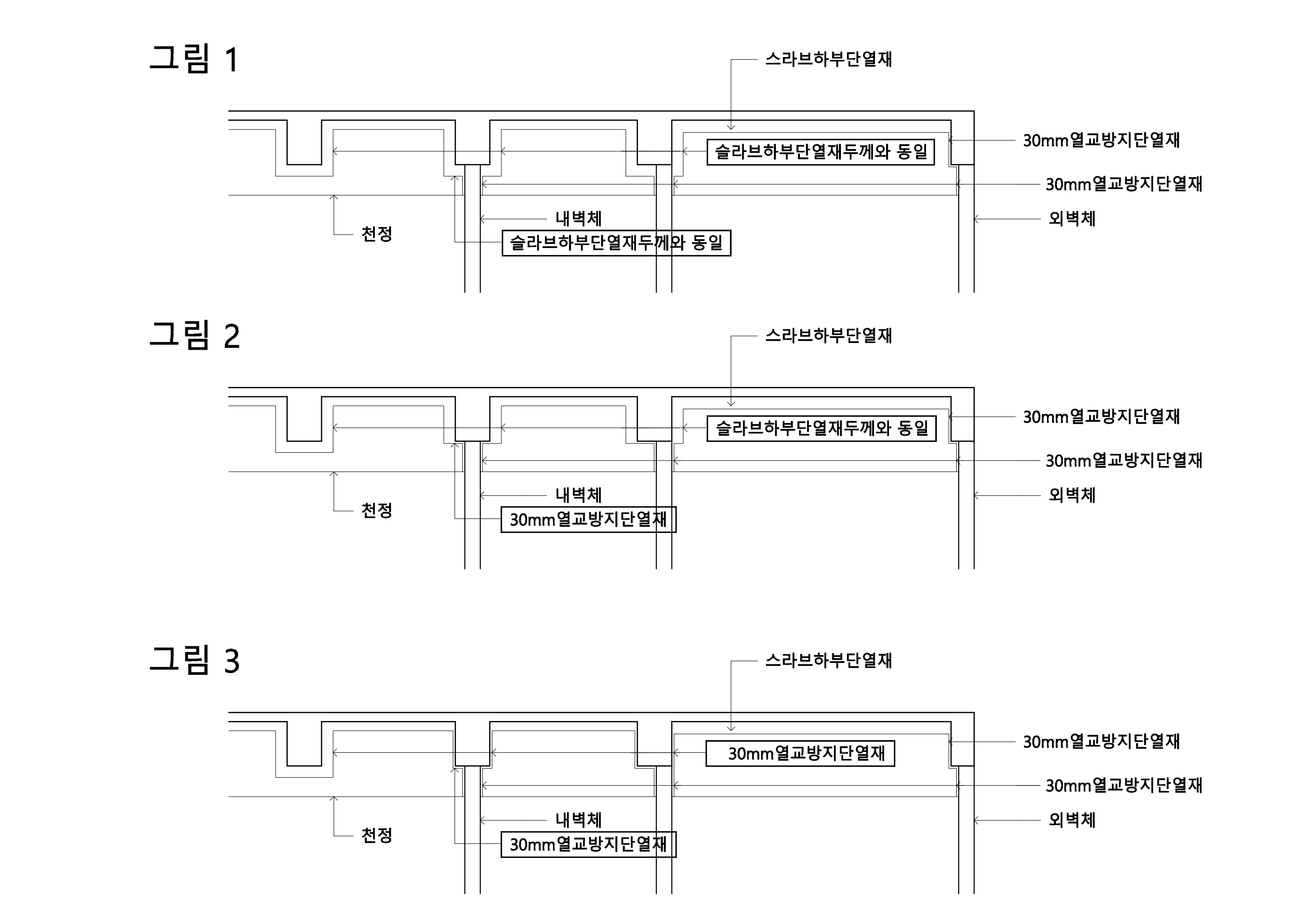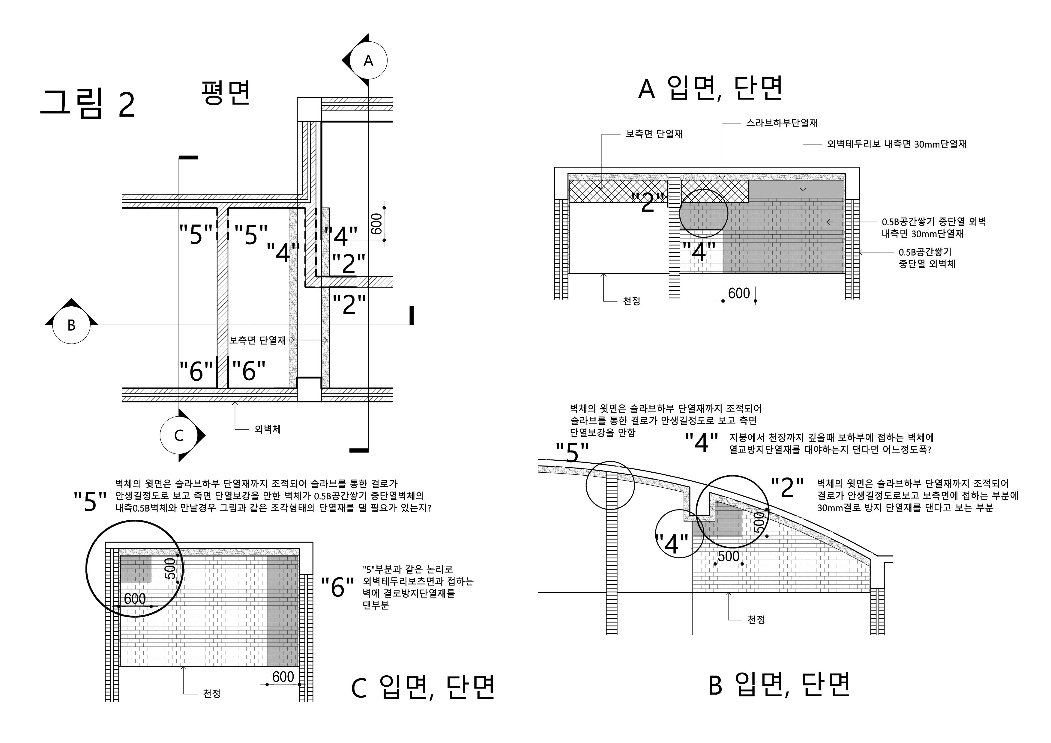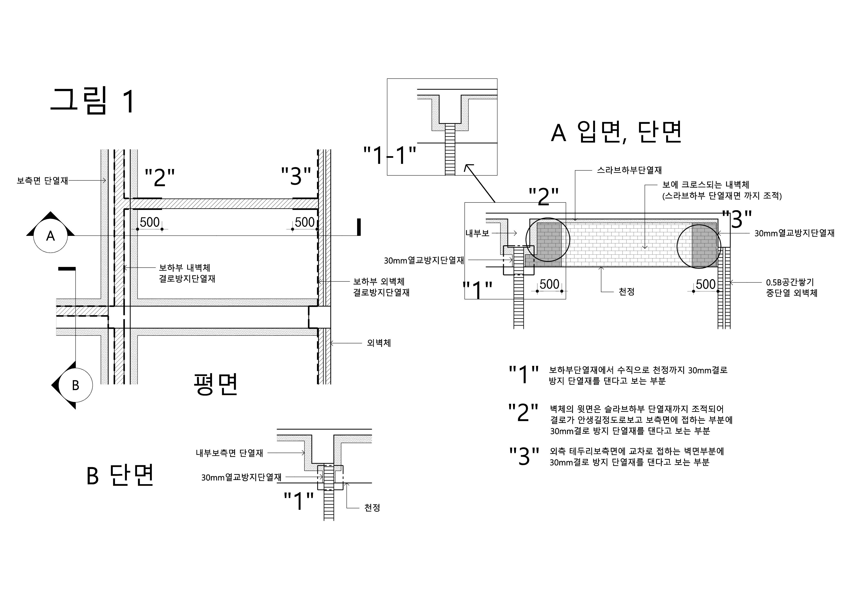 2. 1번 도면에서 "3"이 보이지 않긴 합니다만.. 이 역시 원칙상 보하부와 만나는 벽체는 결로방지단열재를 대는 것이 맞습니다.