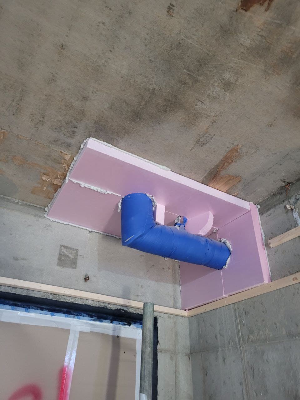 참고로, 협회 회원사가 슬라브 하부로 연결되는 우수관의 열교차단을 위한 단열 공사의 사진입니다.