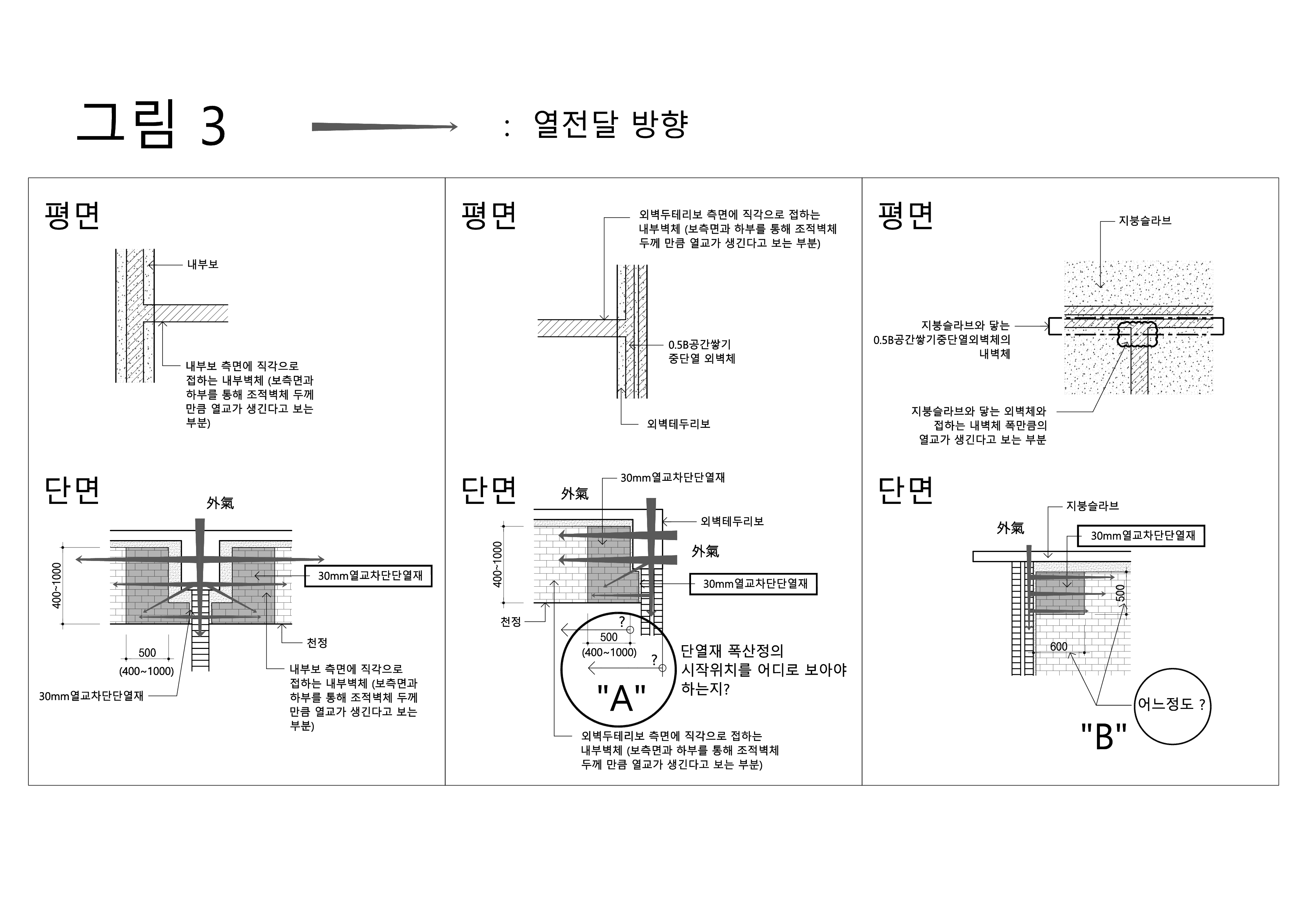 이 부분도 지붕과 직접 닿아 있는 벽체에 열교차단단열재를 댈 경우와 같이 보측면에서 400~1,000폭으로 대는 것인지? (아래 5번 에 첨부한 그림의 “A”부분 참조) 도면상은 전체적으로 보측면과 접하는 벽체량이 많아 수량을 고려하여 500mm정도의 폭으로 표기했는데 적당할까요?