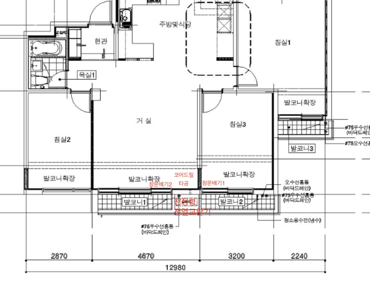 발코니1과 발코니2 사이는 현재 실외기가 비치되어 있습니다. 실외기 위에 천정형 전열교환기를 설치하려고 합니다.