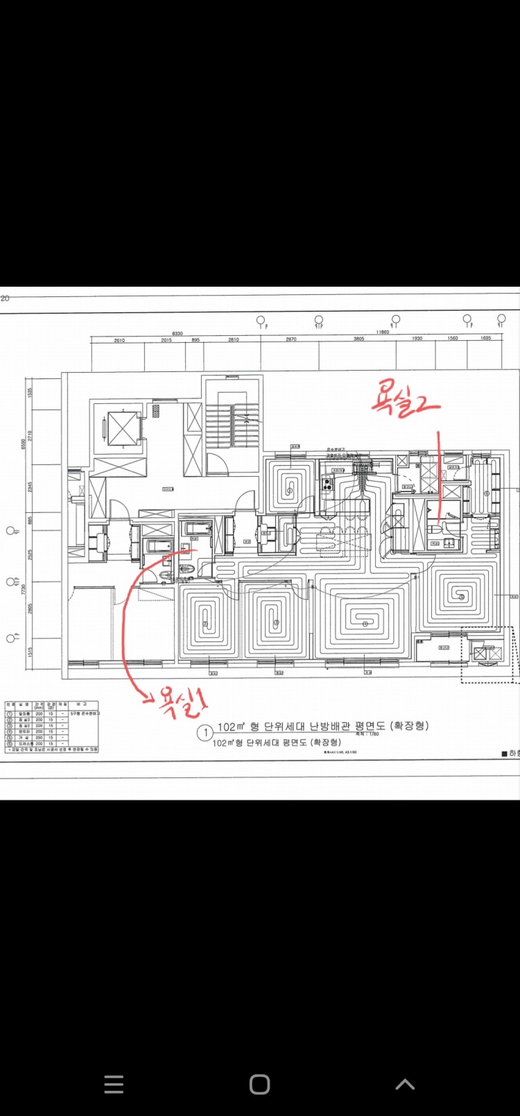 난방배관평면도를 확인해보니 상기공동주택의 욕실1, 욕실2에 난방배관이 있는것으로 확인되었습니다.