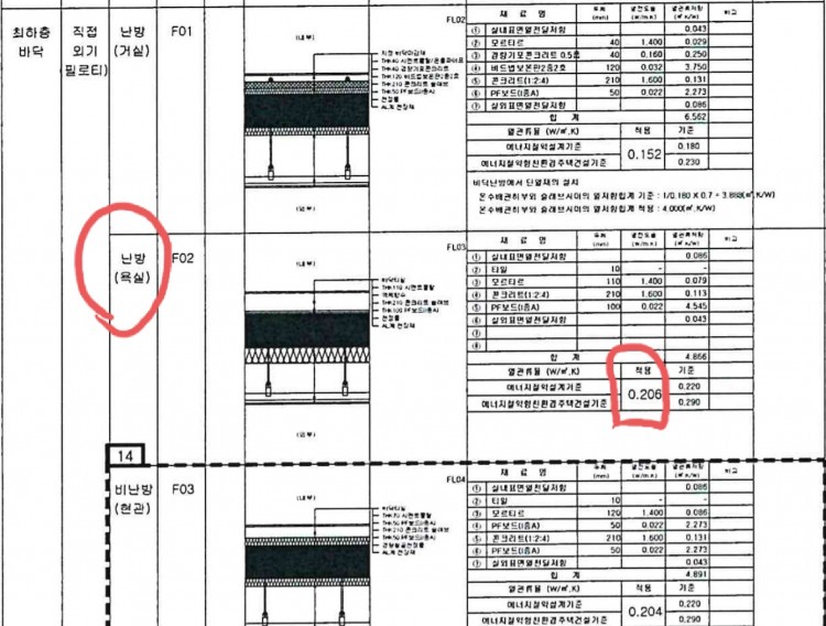 최하층에 거실의바닥- 간접외기 욕실(난방됨)이 법령에 부합한 열관유율인지에 대해 문의드립니다. (난방배관평면도 상에는 욕실바닥으로 난방 바닥이 되어 있는것으로 되어있습니다.)