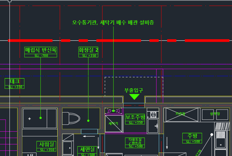 지금 집에살때는 밸브를 잠궈서 난방조절을 했는데, 그걸 생각해서 그런지 편하게 쓰려고 화장실에 넣으려고 했었습니다. 답변을 들은후 상의해서 자동온수분배기를 사용하기로 했습니다. 답변감사합니다. // 한가지더 질문이 있는데 오수통기관을 제일 오른쪽 부엌쪽에 두는게아닌 주방 왼편 보조주방의 세탁기 뒤쪽에 설비층을 둬서 올리는 건 어떻나요? 세탁기보시면 뒤쪽에 틈을줘 배관라인을 잡아줄 계획을 했는데 그곳에 통기관을 주어 설비벽을 치려고 합니다. 바로 그려보니 샤프트 공간만 250mm으로 주고 혹시몰라 벽체를 50mm으로 잡아서 그려놨는데 그려지긴 합니다만..