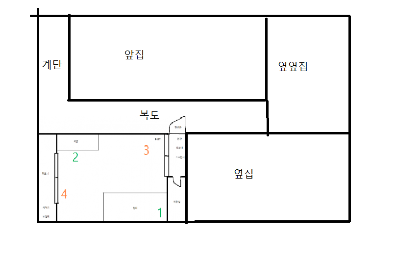- 그러니까 발코니왼쪽, 침대 아래쪽이 건물 외부 / 화장실과 싱크대 오른쪽이 옆집 /  현관문과 책상 위쪽이 복도입니다.