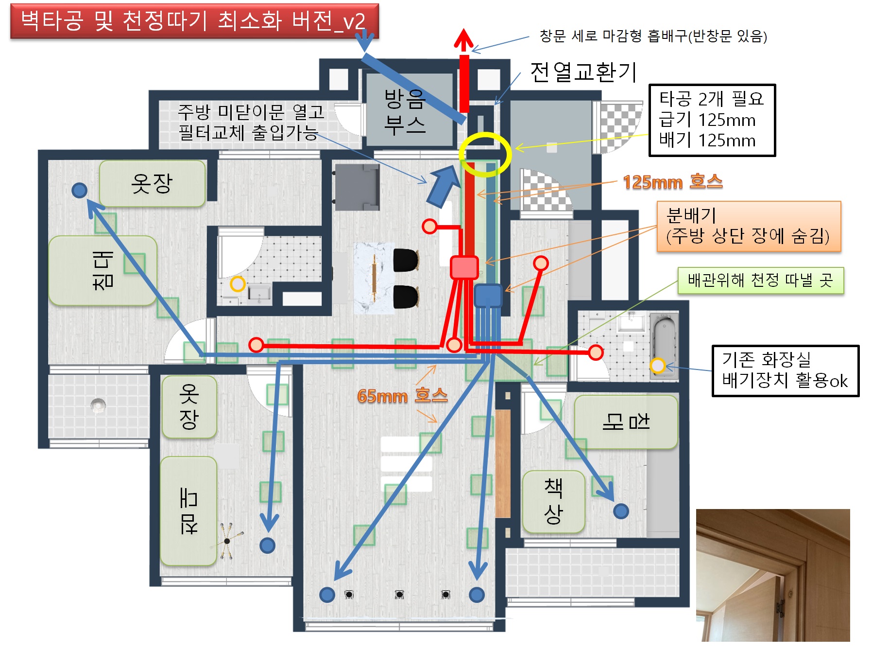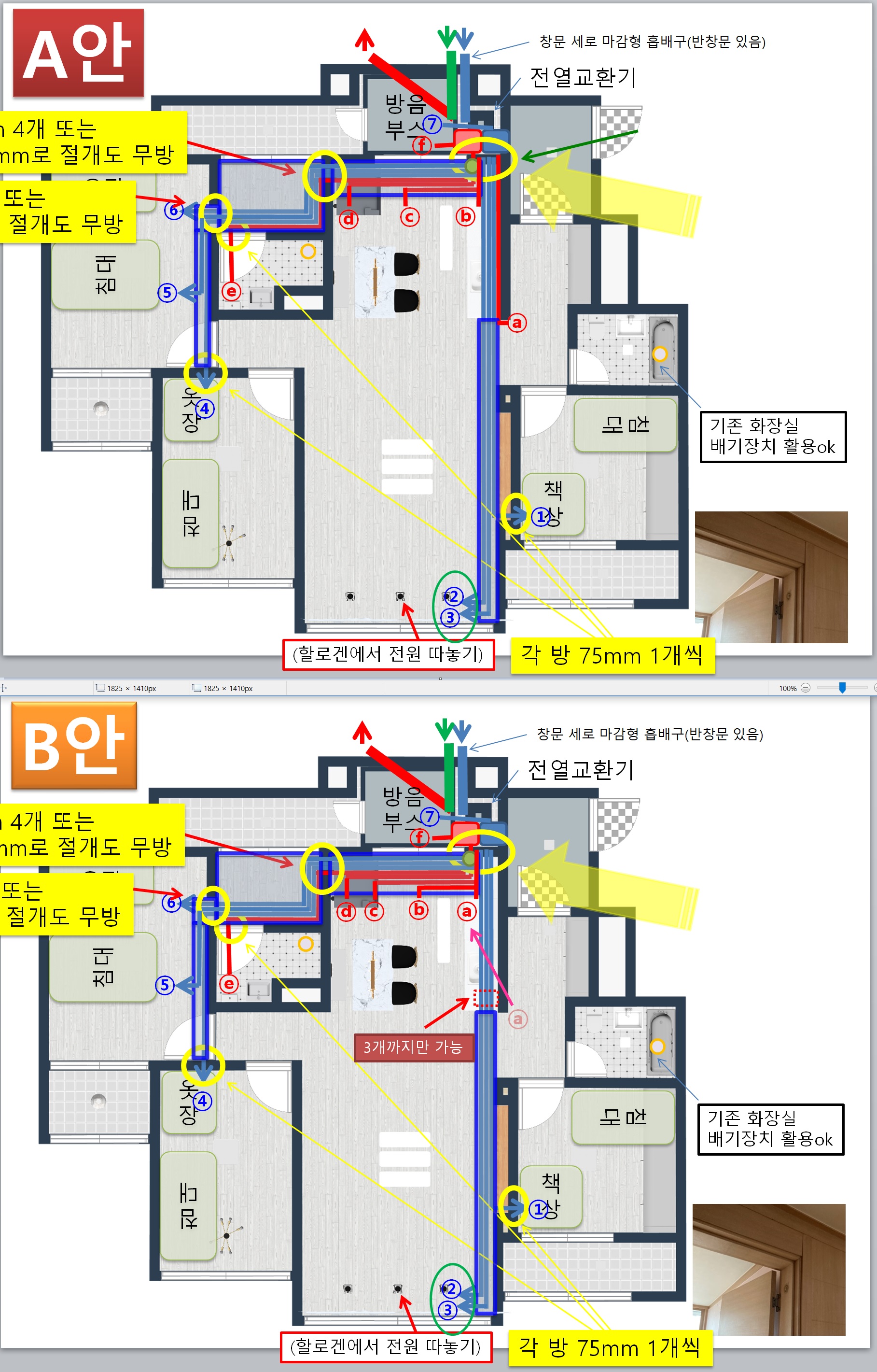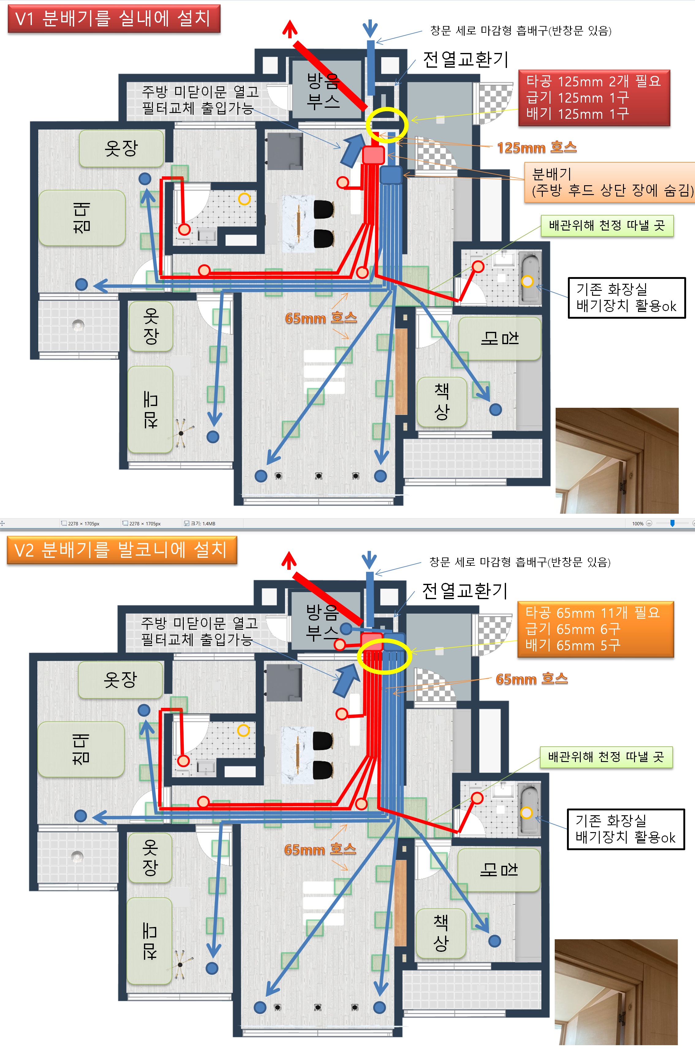 배기는 각각의 화장실 및 현관에도 추가하시는게 더 좋아 보입니다!