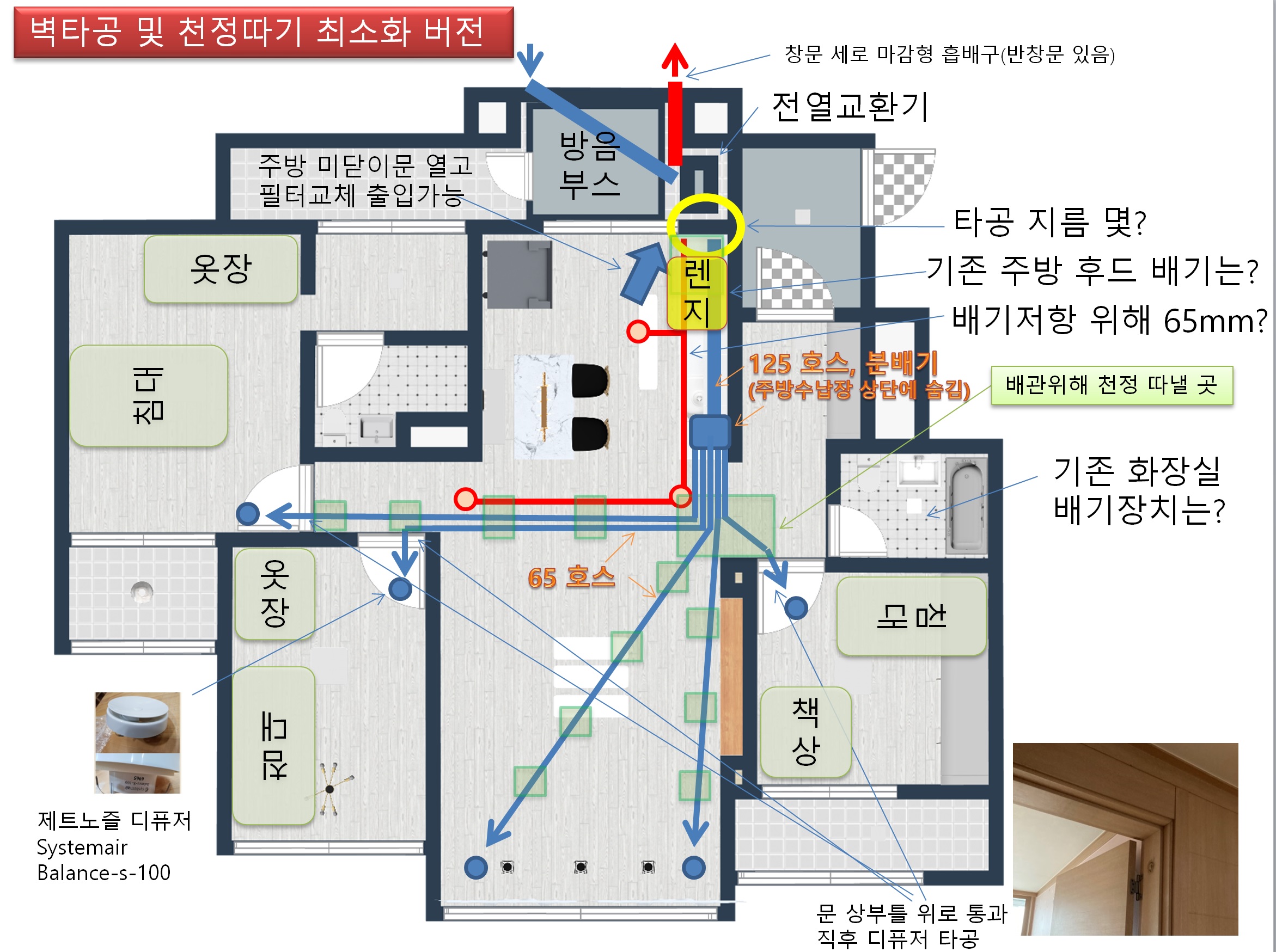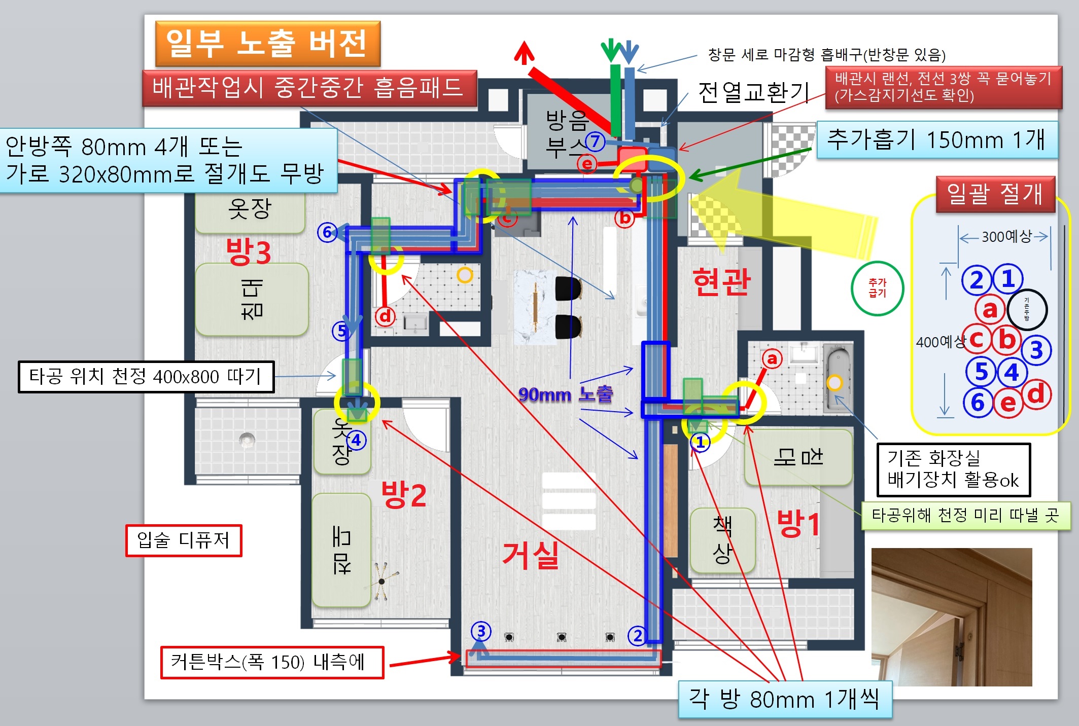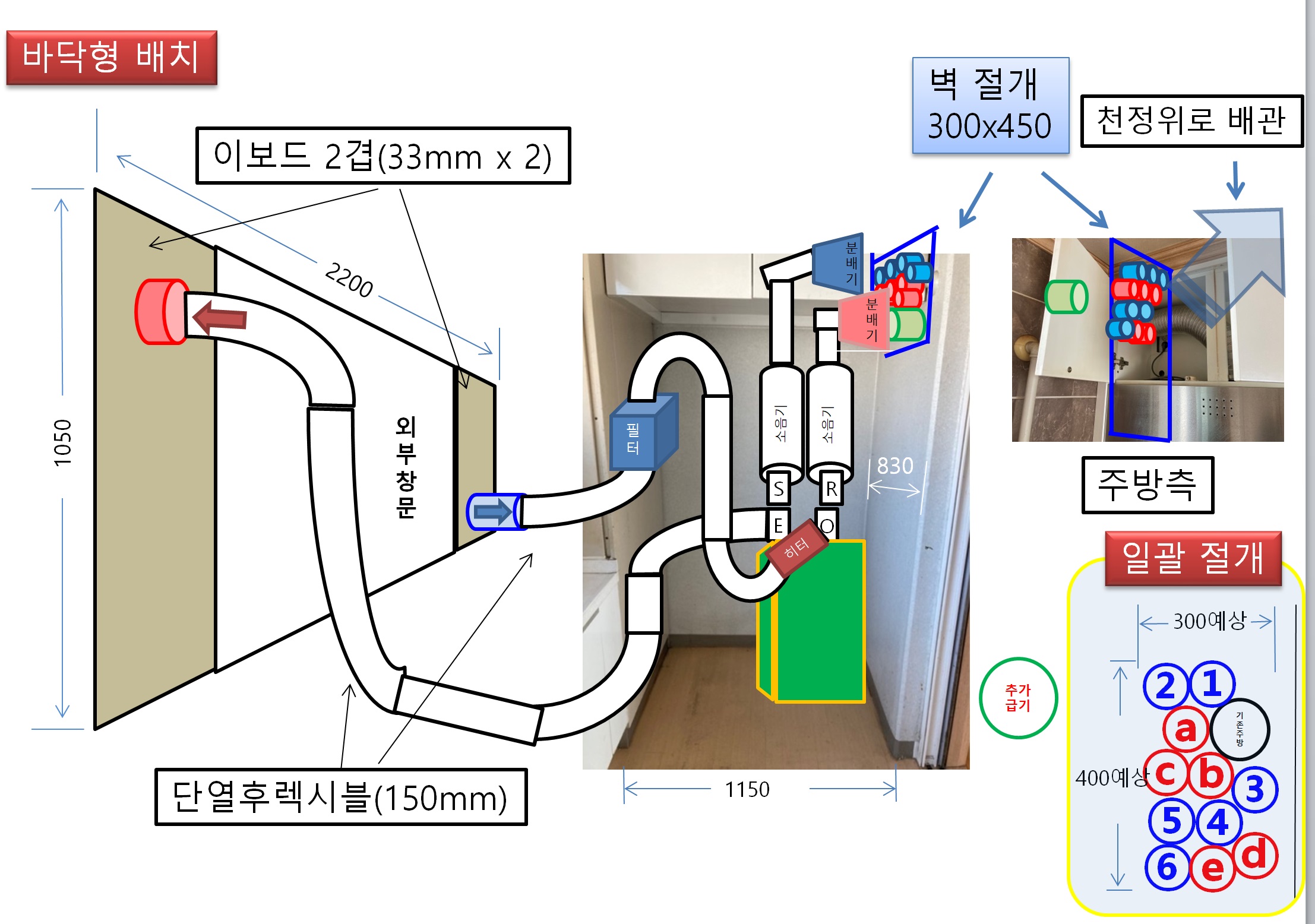 A안 : 발코니에 소음기를 거쳐서 주방쪽으로 125mm 메인 파이프 진입후 주방 상단 수납장 안쪽을 통해