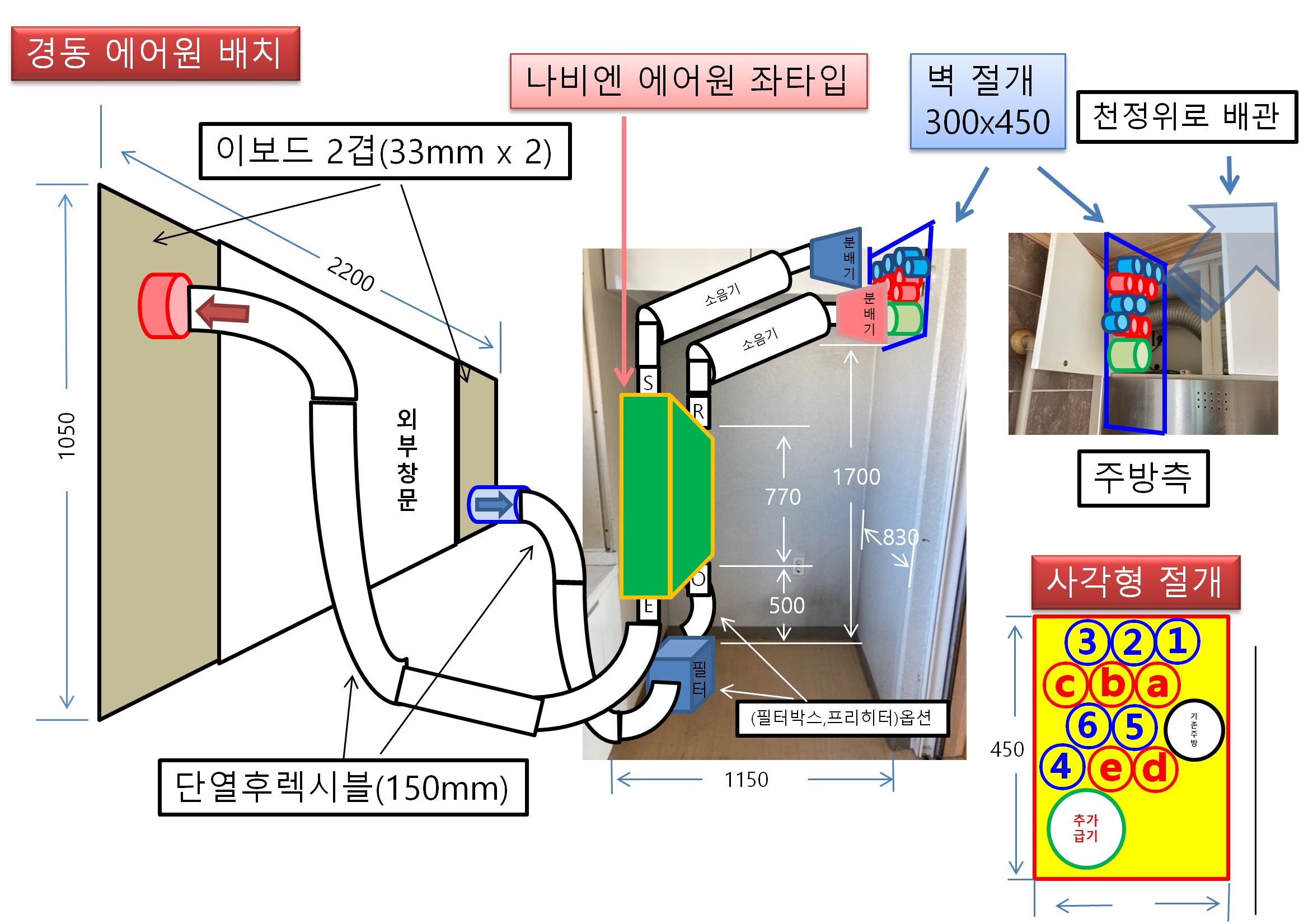 1. 외부창 타공이 부담스러워서 반창문 양쪽(좌우 2200)에 세로로 흡/배기구를 설치