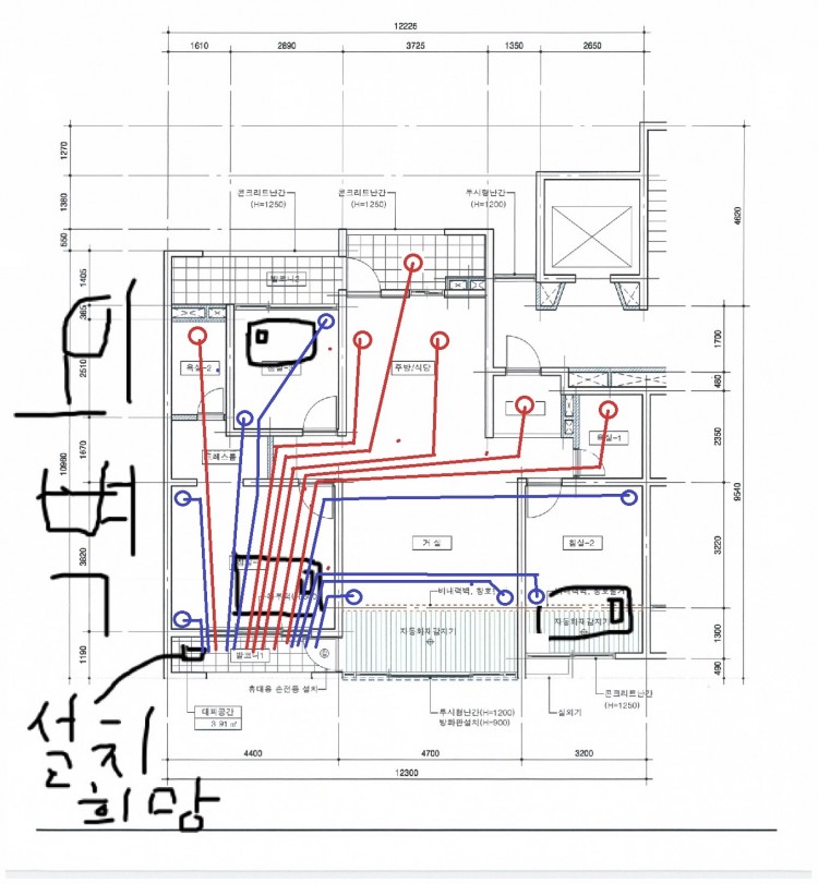 도면에서 베란다1에서 안방으로 넘어오는 벽에 75파이 구멍 9개를 내야 합니다. 벽은 가운데 높이 90cm 하부턱 위에 샷시가 있고 샷시 왼쪽에 길이 75cm 벽 샷시 오른쪽 길이 65cm 벽이 있습니다. 왼쪽에 75파이 구멍 5개를 내고 오른쪽 벽에 4개를 뚫을 예정입니다. 또 베란다1에서 거실로 가는 통로 문 위 인방에 3개 구멍을 낼 예정입니다.